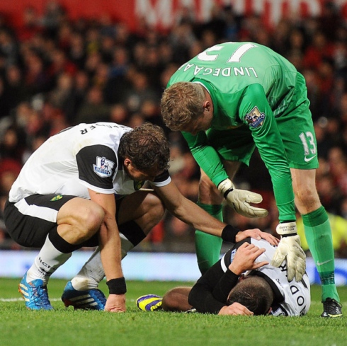 Полузащитникът на Норич Робърт Снодграс получи сериозна травма по време на осминафиналната среща от Купата на Лигата против Манчестър Юнайтед. Както е известно, 26-годишният футболист много дълго време получаваше медицинска помощ на терена, който напусна в 65-та минута. Заради това главният арбитър Кевин Фрнд удължи мача с 11 минути, за да компенсира загубното време.