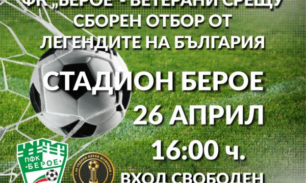Футболната история на България се събира в Стара Загора в едно от най-очакваните спортни събития в града, което ще върне на терена легендите и ще срещне поколения фенове. На 26 април стадион "Берое“ ще бъде домакин на демонстративен мач между ветераните на "Берое“ и сборен отбор от футболни легенди на България, посветен на 40 години от шампионската титла на клуба и 110 години от създаването му. Това съобщи Теньо Минчев, председател на УС на ФК "Берое 1916 - ветерани" - главен организатор на събитието.