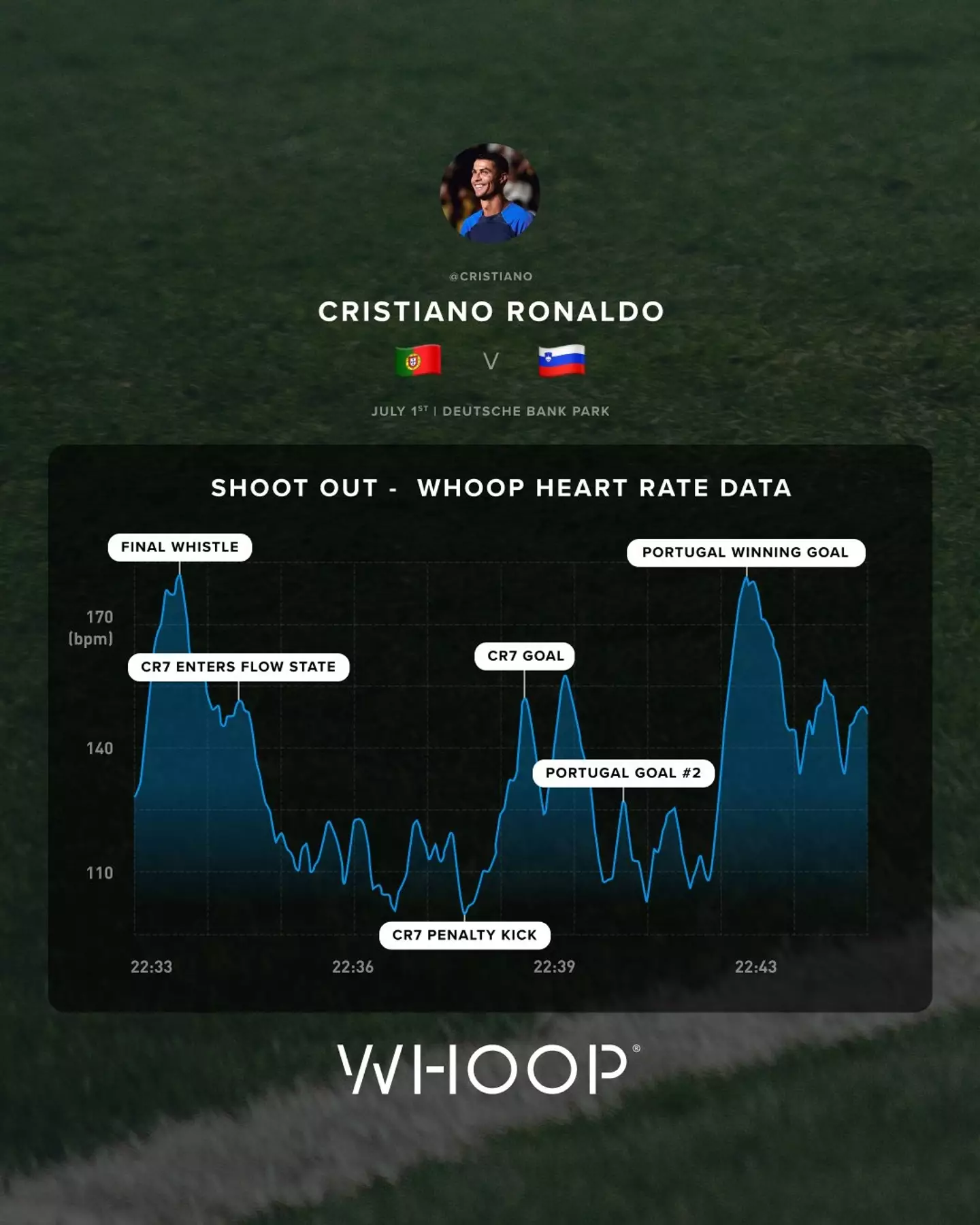 Пулсът на Кристиано Роналдо бе наблюдаван от WHOOP по време на мач със Словения и резултатите са наистина умопомрачителни
