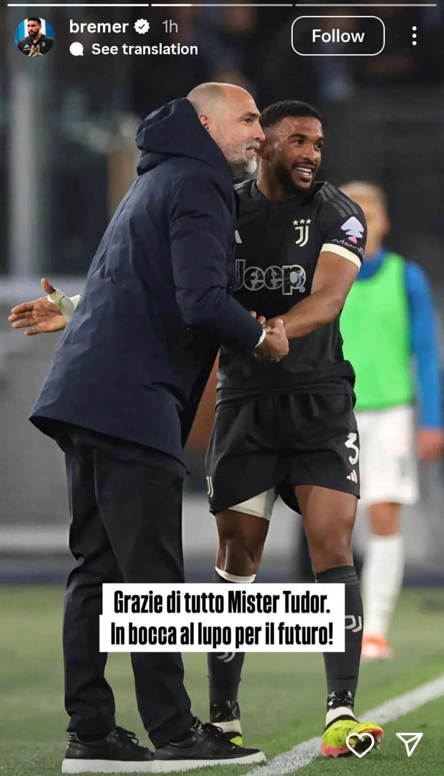 Глейсън Бремер бе първият от играчите на Юве, който публично изрази благодарността си към Тудор след новината за напускането му в понеделник. "Благодаря ти за всичко, старши, успех в бъдеще“, написа той в историята си в Instagram .