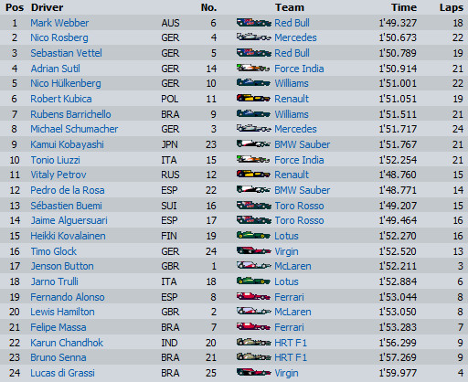 Пилотът на Ред Бул Рейсинг Марк Уебър спечели провелата се днес клалификация за Гран При на Малайзия на пистата Сепанг, въпреки непрестанният дъжд на трасето, който се изля на трасето. Втори остана Нико Розберг от Мерседес, а трети съотборника на Уебър - Себастиан Фетел.
