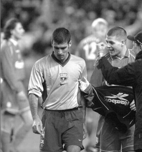 Сезон 2000/2001. Гуардиола не забелязва протегнатата ръка на Джерард, след като Пуул изхвърля Барса от Купата на УЕФА.